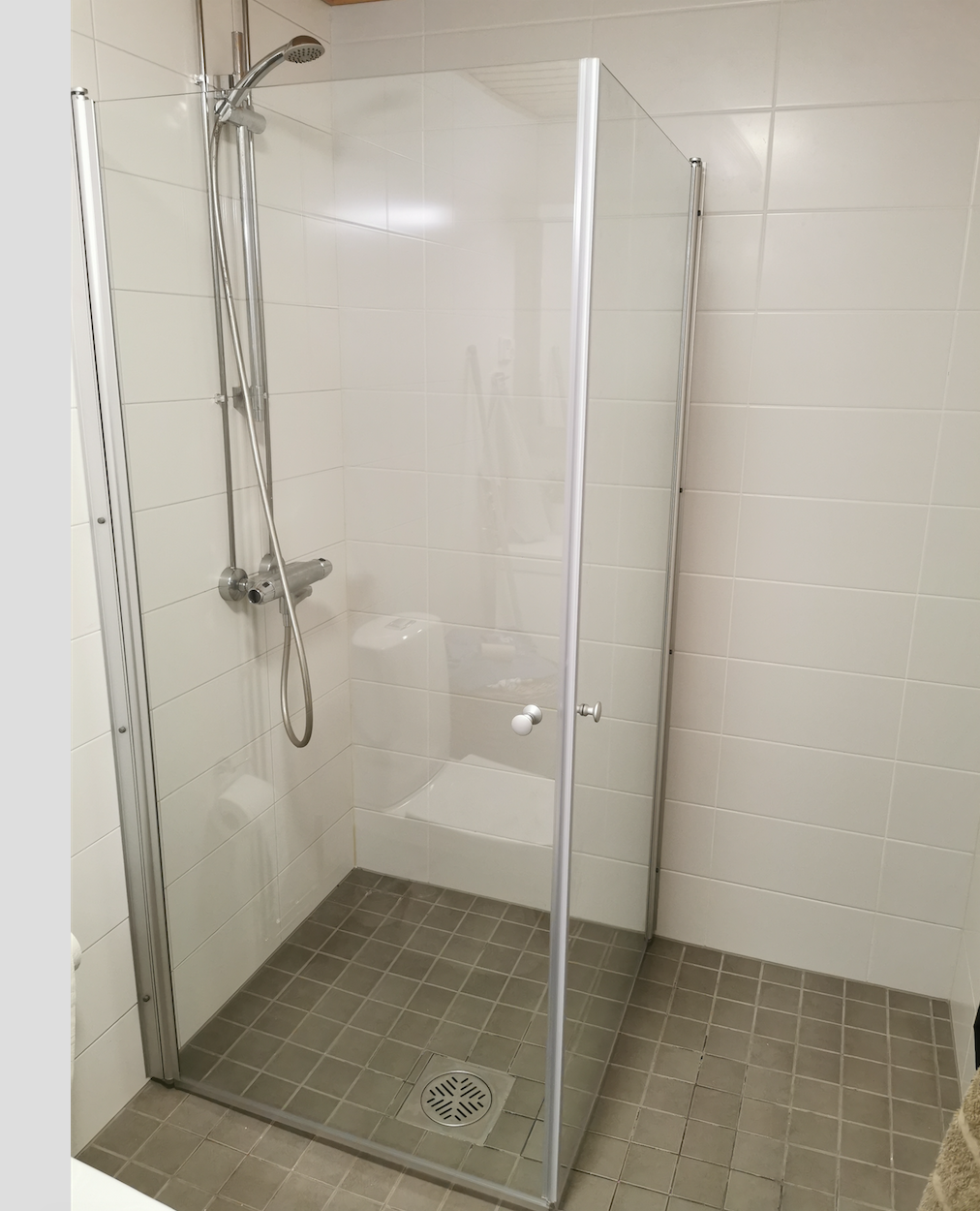 Lumo-kodit järjestivät suihkukaapin korjaamisen ensi-tilassa. Selvisin haaverista todella onnekkaasti, vaikka toistaiseksi olenkin äärettömän kiitollinen käsipuoli!